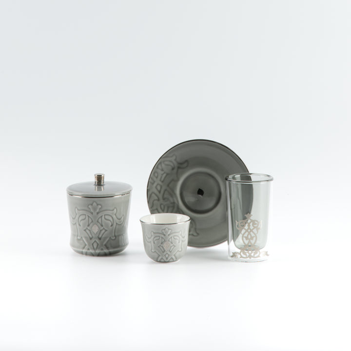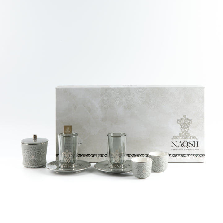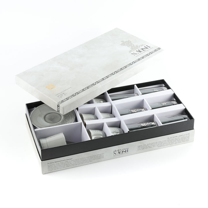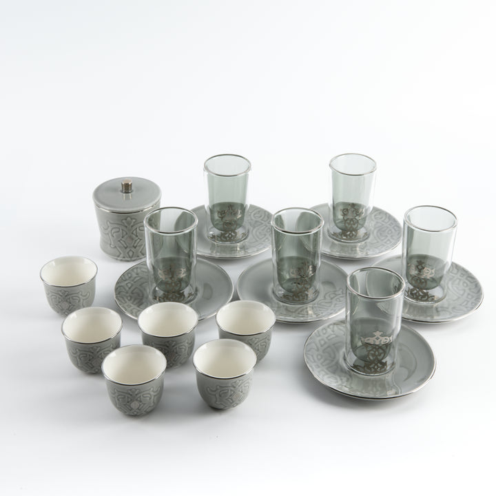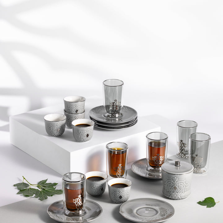 طقم استكانات الشاي والقهوة العربية 19 قطعة من نقش- رمادي و فضي